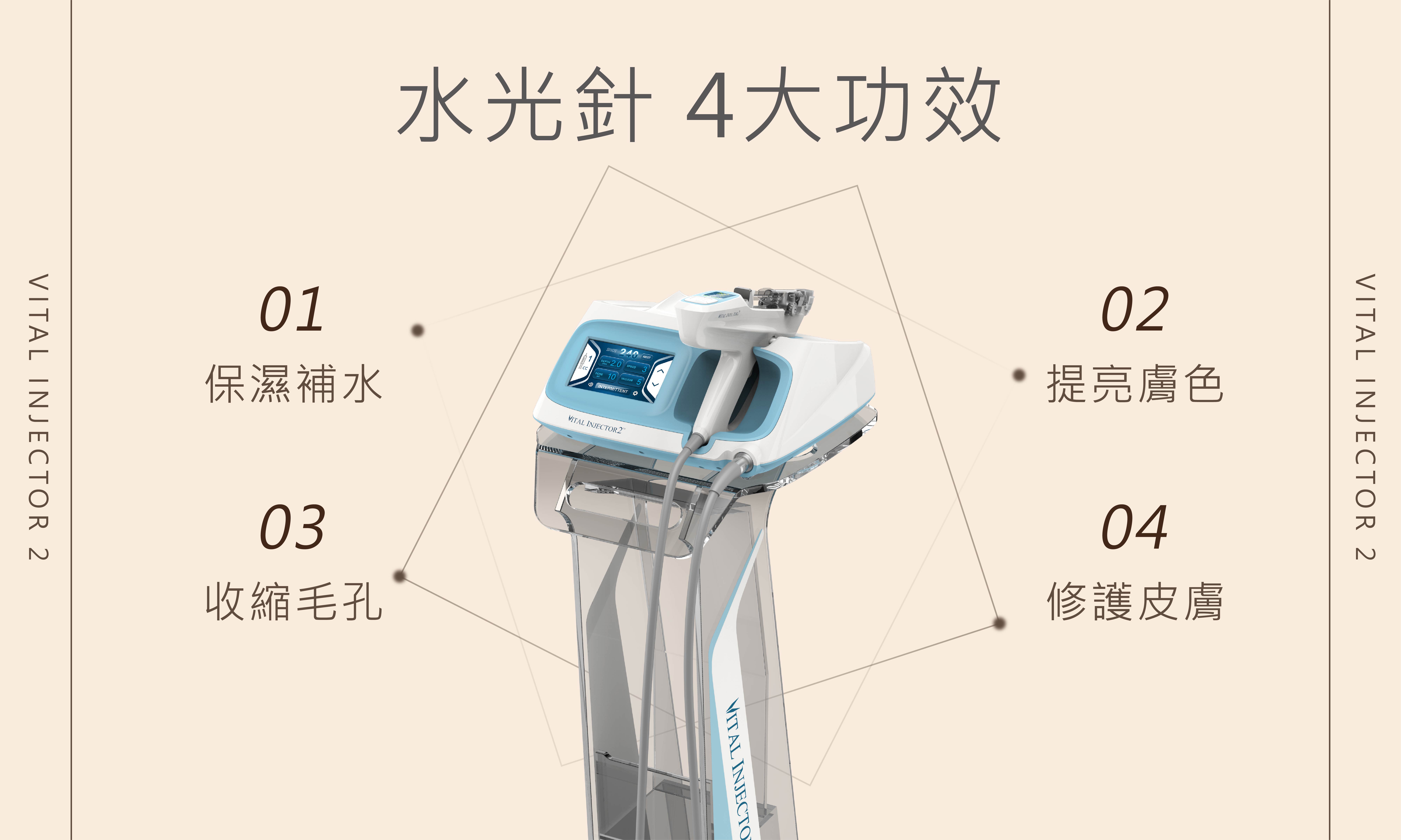 Vital Injector 2水光注射透過微針,將玻尿酸、傳明酸、維他命C等營養物質直接輸送到真皮層。其中玻尿酸具有強大的保濕功能,能夠從根本上解決皮膚乾燥的問題,幫助肌膚維持水潤。