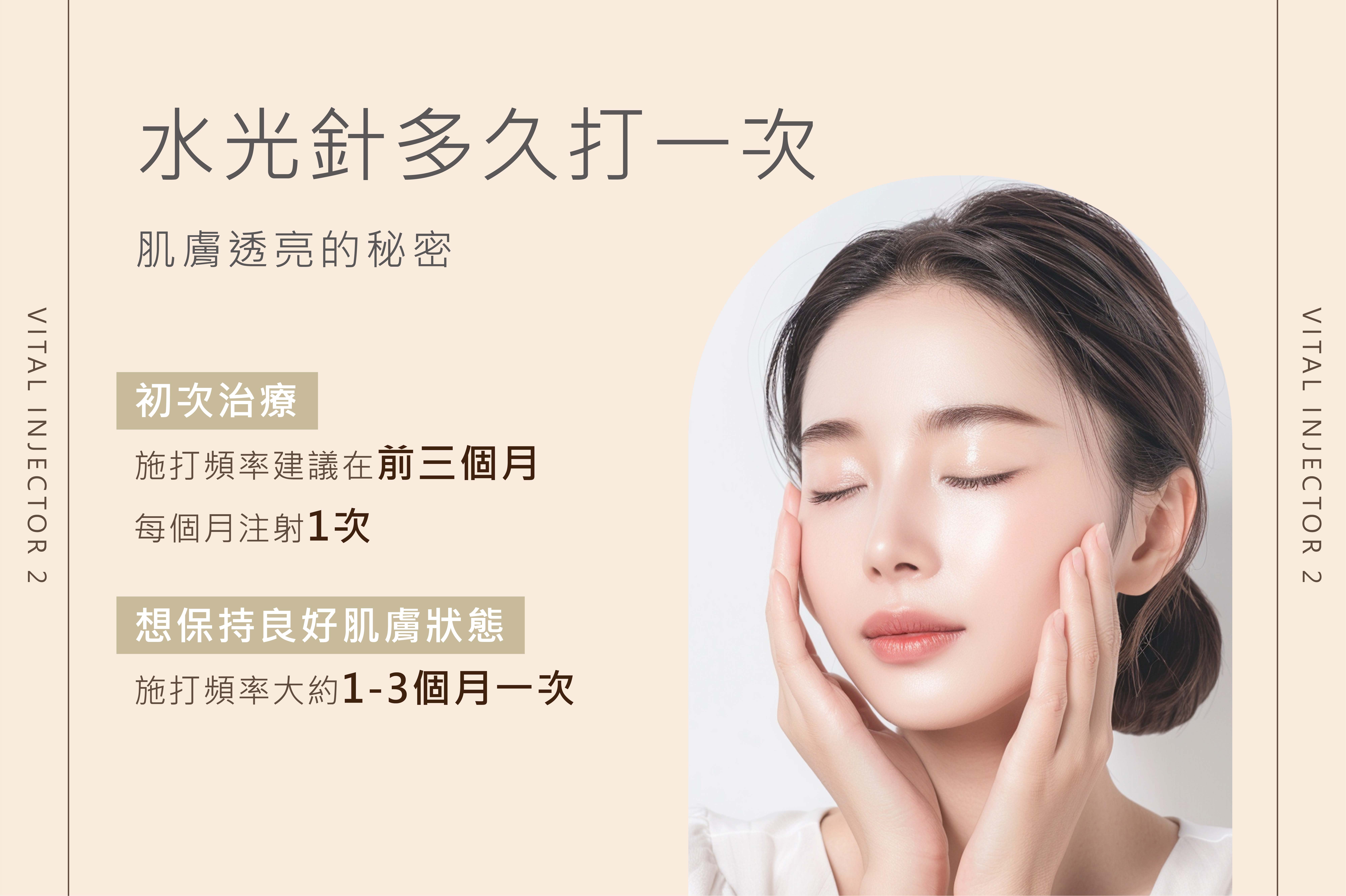 醫美水光針在初次治療時,建議在前三個月每個月注射1次,連續施打3次之後可達到基礎改善效果。如果想要保持良好的肌膚狀態,之後需要定期注射,醫師將會根據消費者的皮膚情況建議打水光針的間隔,大約1-3個月進行一次療程。