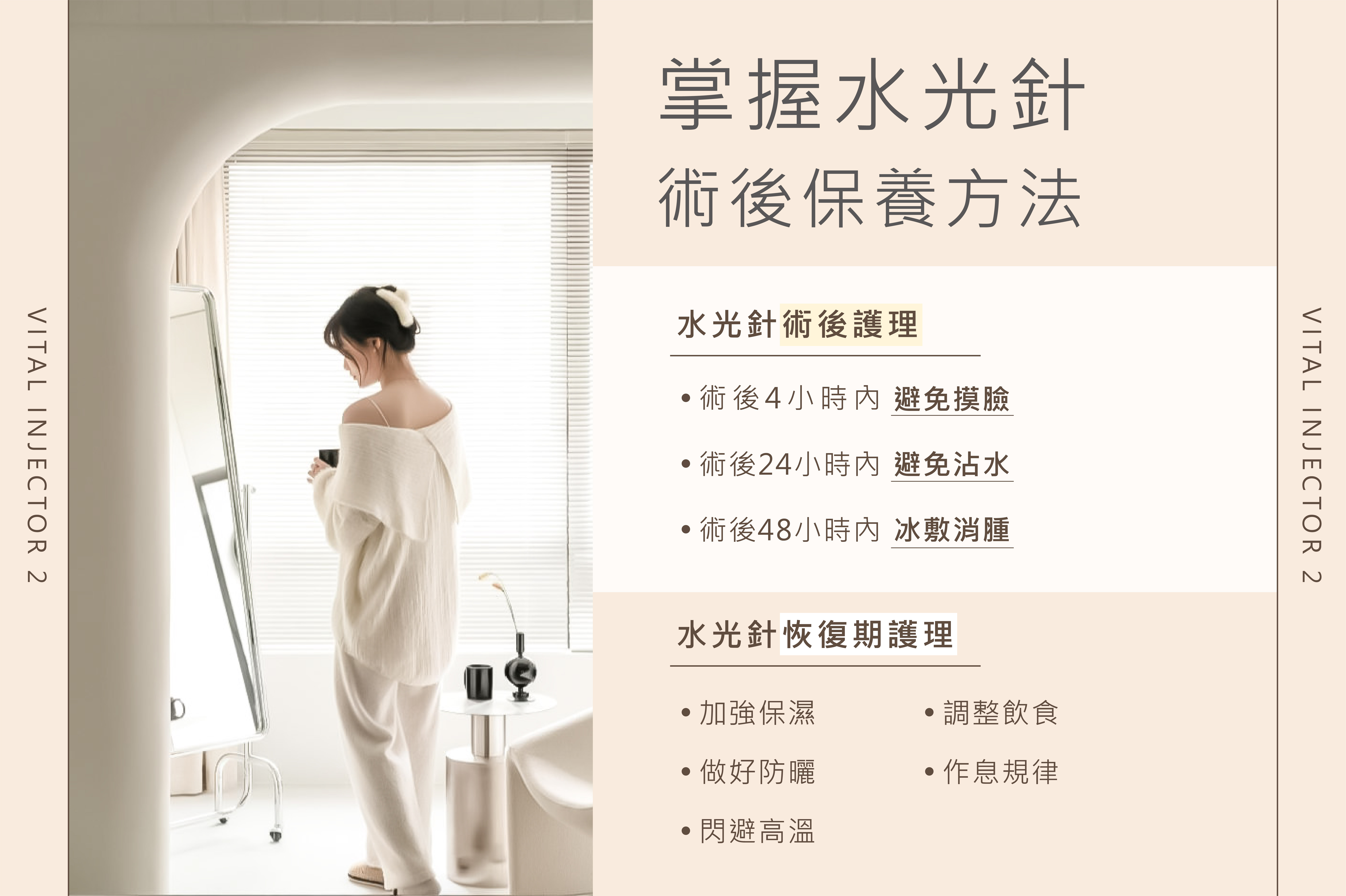 • 輕柔清潔:水光針術後1天內不可沾水,如需清潔面部,可使用生理食鹽水輕輕揉搓