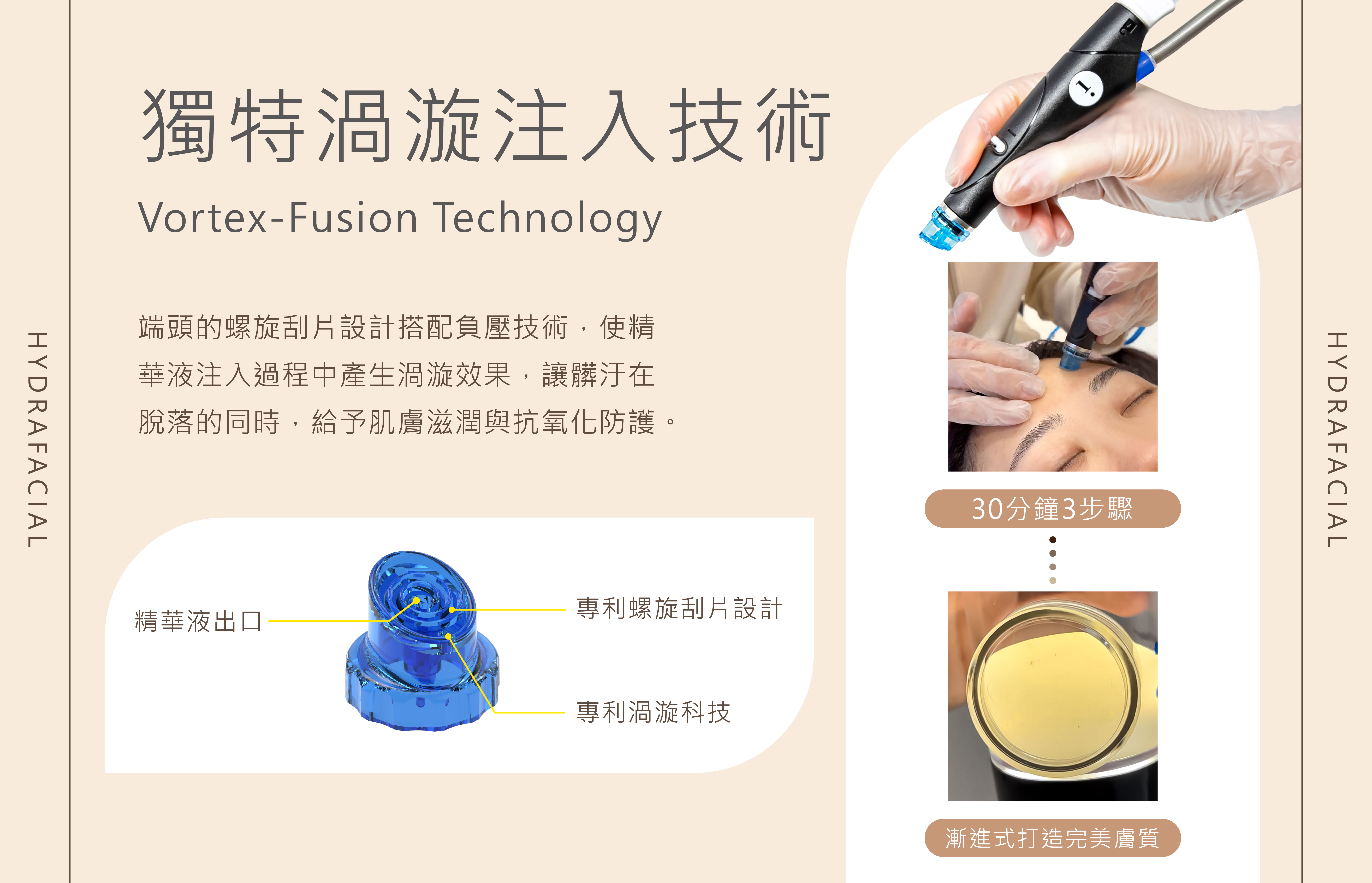 海菲秀Syndeo英文名為HydraFacial,是一種美國研發的非侵入性的皮膚護理項目。二代海菲秀的核心原理是利用Vortex渦漩注入技術,透過螺旋刮片設計的探頭溫和地打開毛孔,並吸出其中的污垢、油脂及老化角質。在清潔的同時,海菲秀機器還會將精華液、舒敏酸類成分和水分輸入到深層肌膚,進而達到滋養的效果。