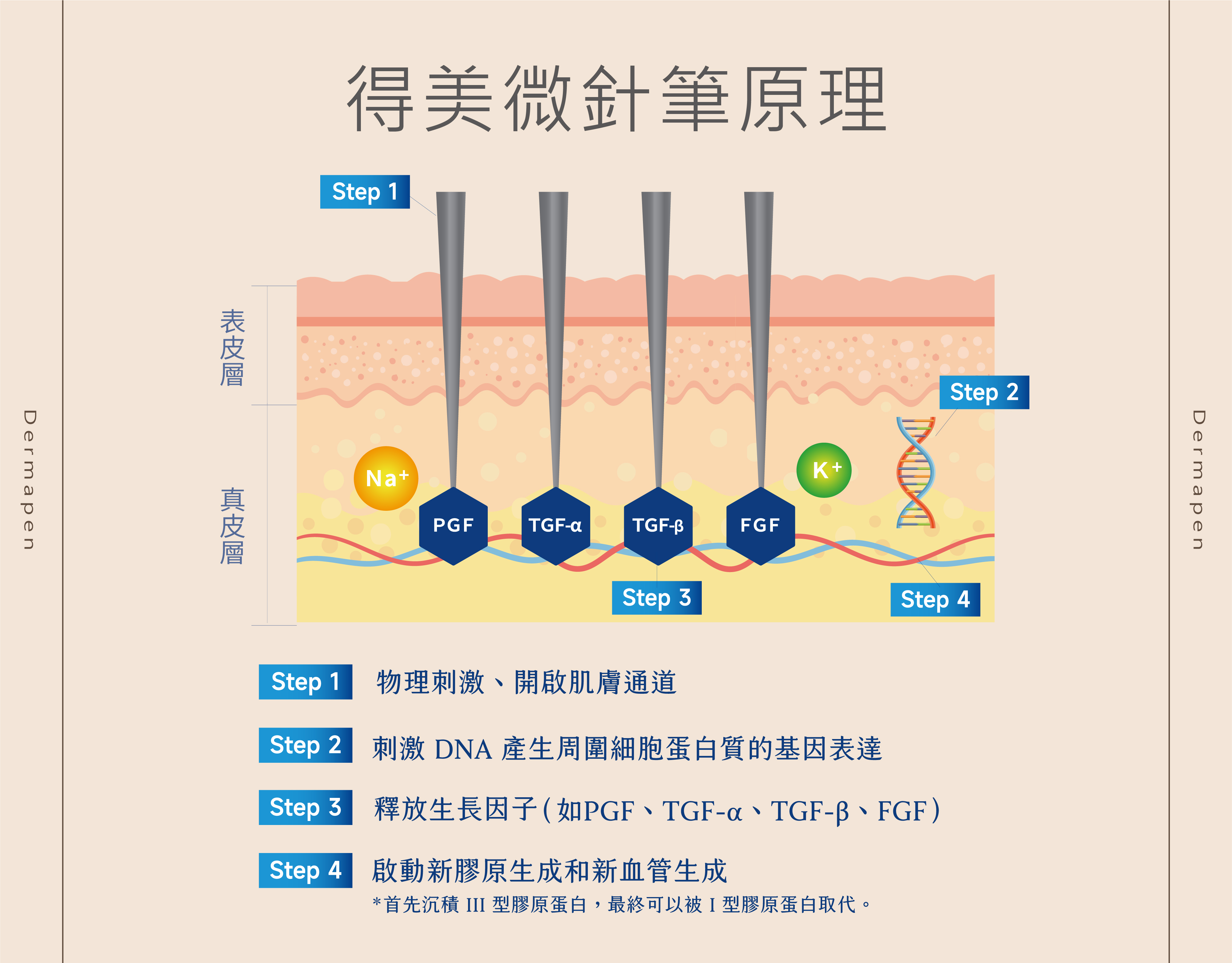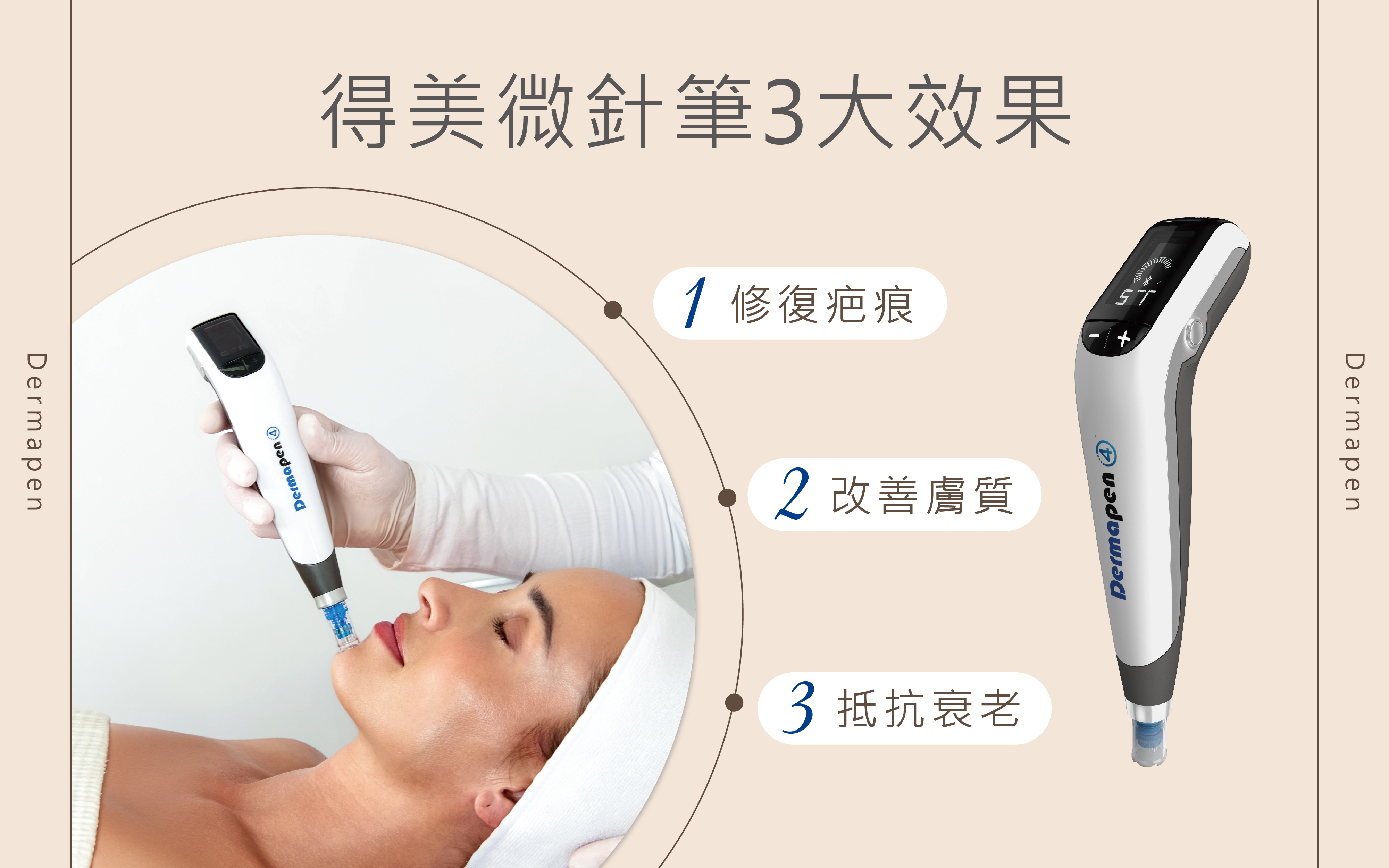 得美微針筆(Dermapen 4)是第四代電動微針,主要用來減少痘疤、毛孔粗大、細紋等皮膚問題。其原理是透過每秒可創造1920個微通道的33G極細鋼針,在皮膚上高速旋轉,刺激肌膚的自我修復機制並促使膠原蛋白新生,進而幫助改善皮膚質地和外觀。此外,該設備獲得美國FDA、歐盟CE、台灣衛福部的三重認證,安全性極高。