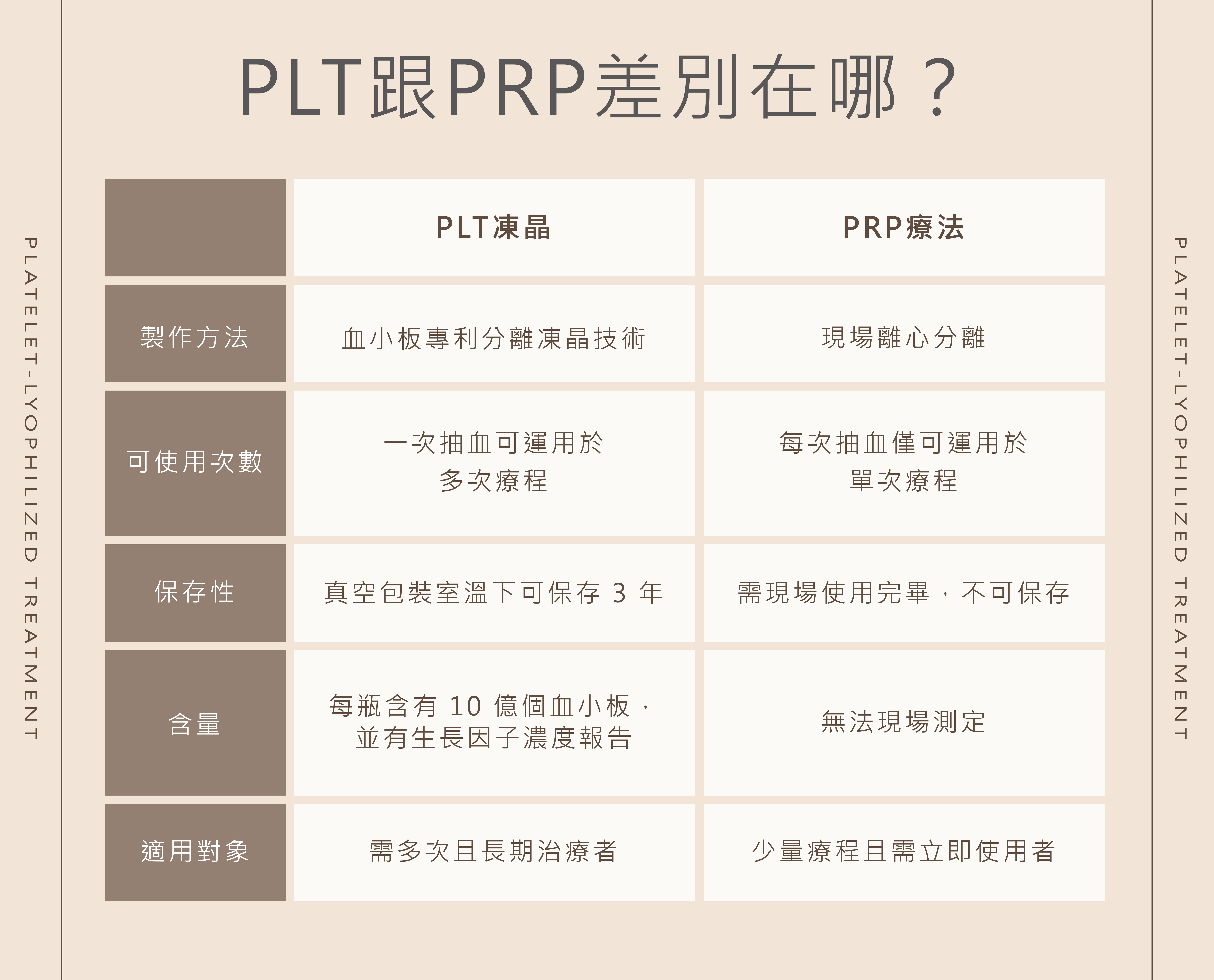 PRP是傳統的高濃度血小板血漿療法,需要現場即做即用,室溫下無法長期儲存,必須當天使用;而PLT凍晶經過一次抽血後,會送去專業的無塵無菌實驗室,進行急速冷凍乾燥處理並製成粉末,保存時間約3年左右。