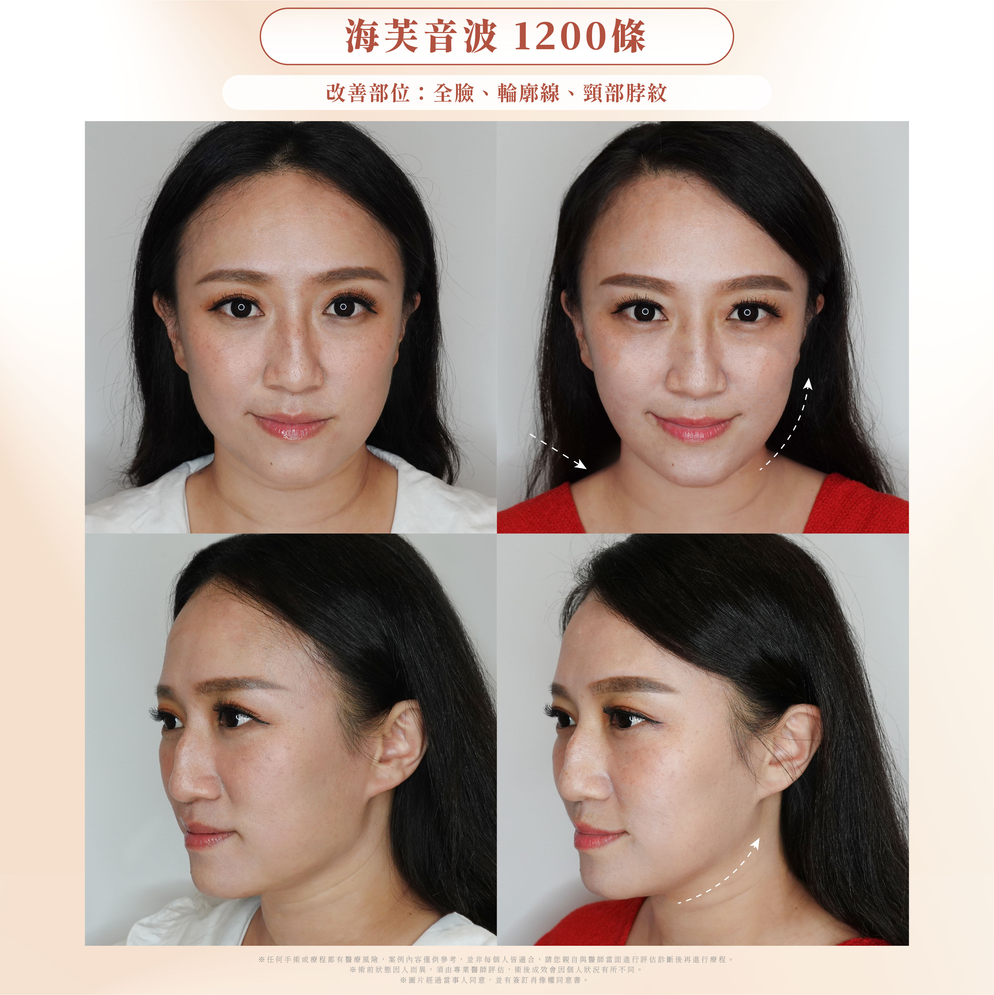 海芙音波聚焦超音波能量傳遞,讓真皮層產生緊縮效果,改善臉部鬆弛以及下垂問題,脖紋也明顯淡化不少,醫生說未來幾個月也會持續刺激膠原蛋白增生,效果會更明顯👍🏼