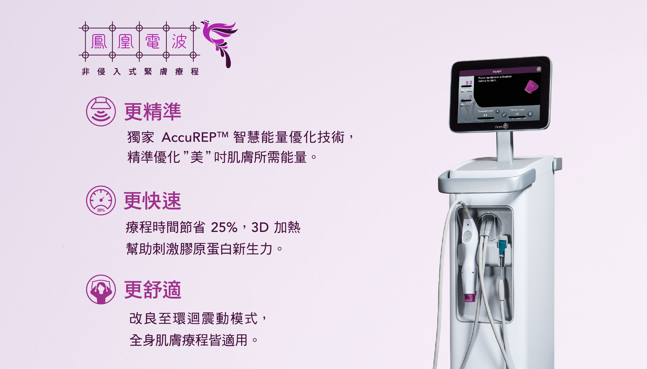 Thermage新一代FLX機型不管在能量的穩定度、治療的速度、拉提緊實的成效上,都有很大的差別。新一代Thermage FLX電波拉皮新式專利AccuREP™ 技術,能增加能量穩定性,治療更精準舒適安全。新一代4.0智能探頭,能縮短約25%治療時間,也同時提高療程舒適度。