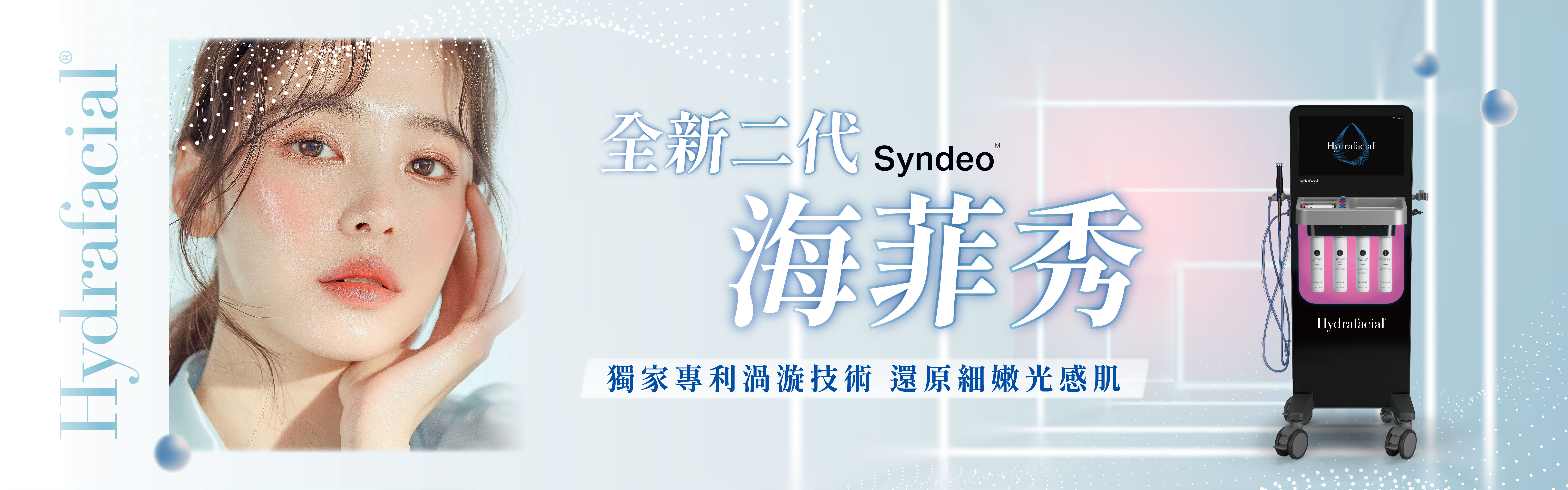 升級版海菲秀 Syndeo 旗艦機結合了水療、微導入和吸引技術。採用獨特「Vortex-Fusion Technology®(渦漩注入技術)」,將端頭渦漩刮片設計搭配負壓技術,進而產生渦漩水流,將精華液、舒敏酸類成分和水分直接輸送到皮膚層中,深入清潔臉部,去除老化角質,同時保濕滋潤肌膚,改善膚質瑕疵和解決多種肌膚問題,使肌膚保持透亮和健康的狀態。