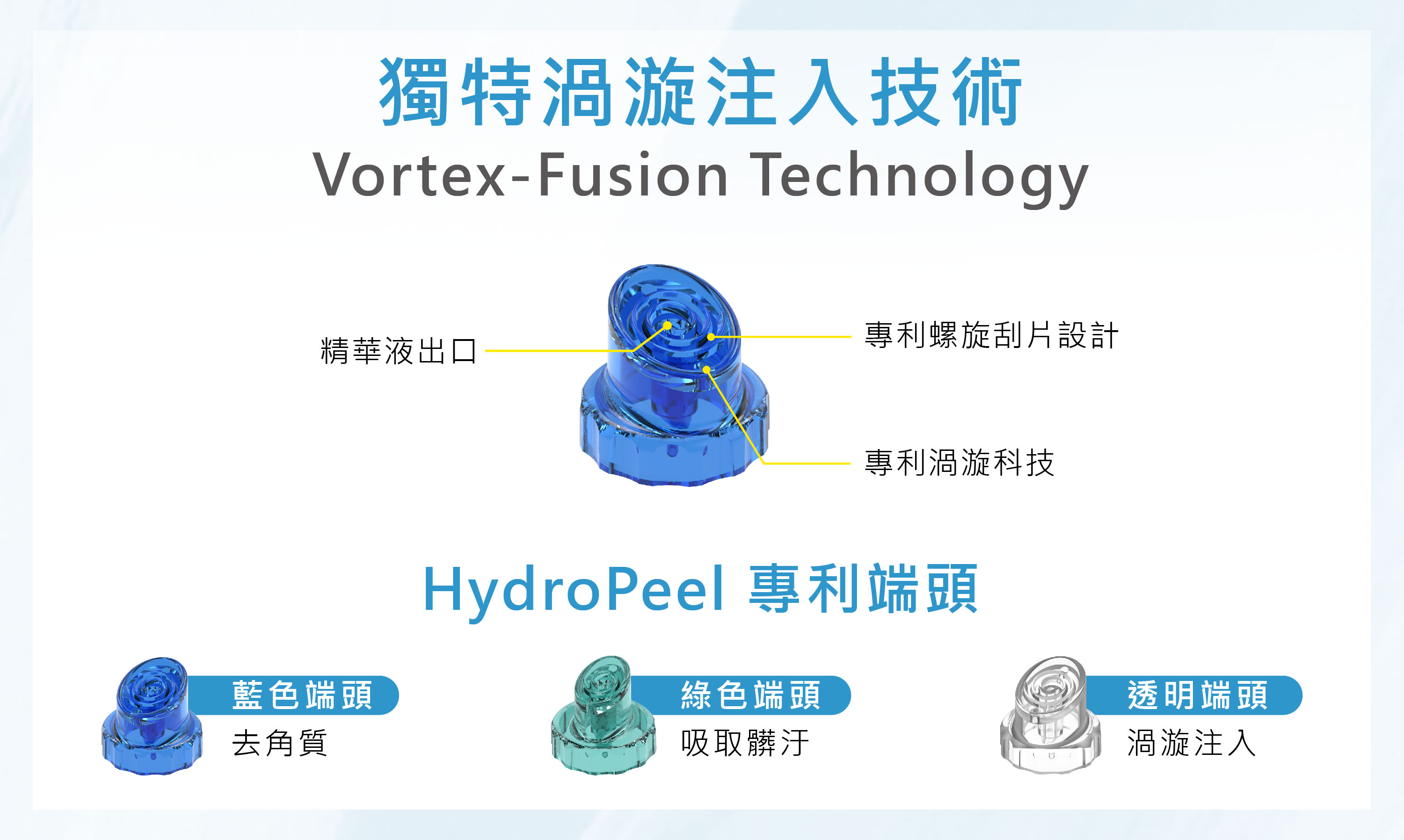 採用渦漩注入技術吸引清理堵塞的毛孔,去除多餘的油脂、黑頭及污垢。
