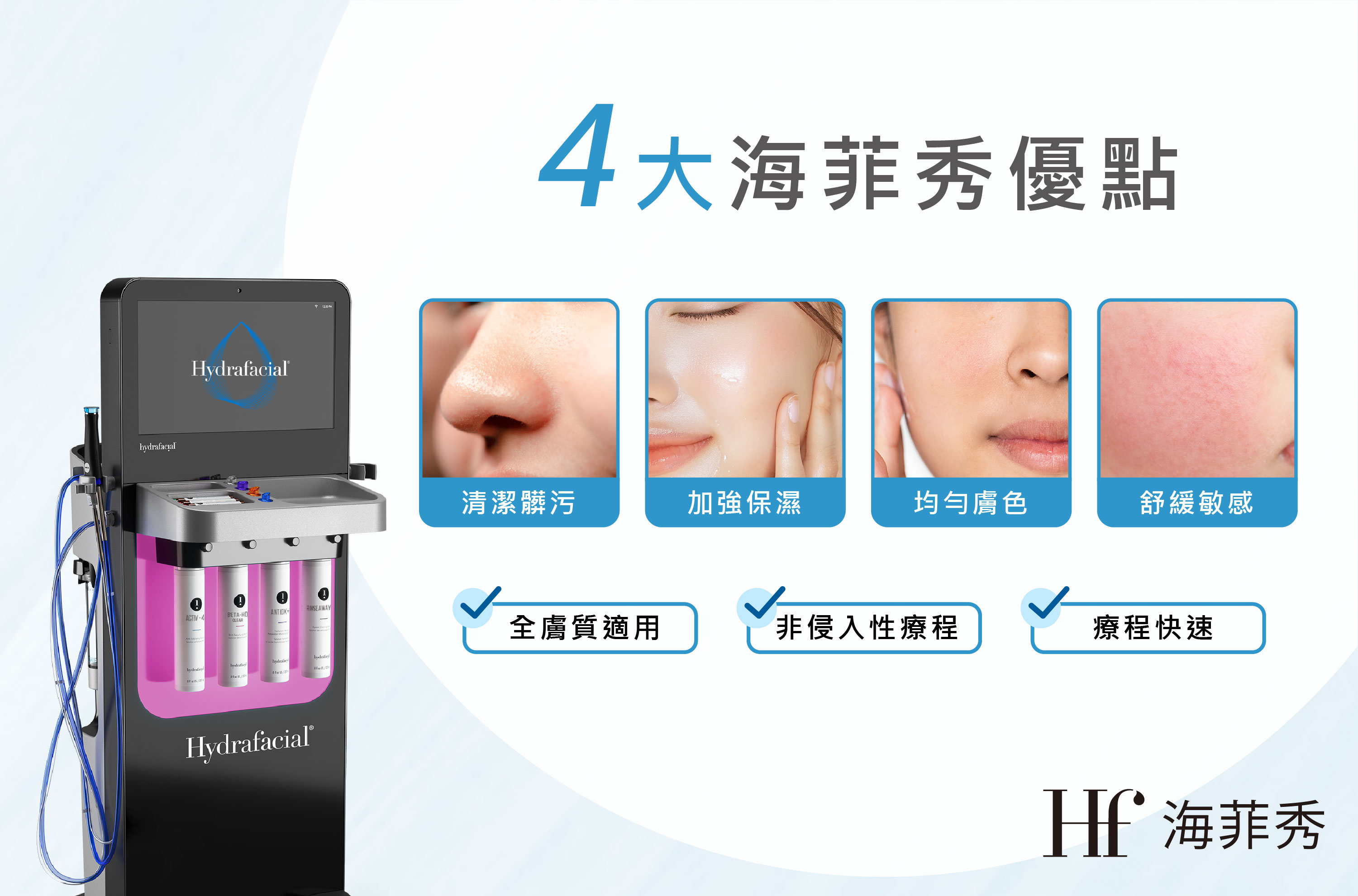 4. 舒緩敏感肌膚 :海菲秀治療是非常舒適的體驗,安撫肌膚敏弱狀況,溫和的吸力和保濕精華導入能改善肌膚問題,同時放鬆舒緩肌膚。