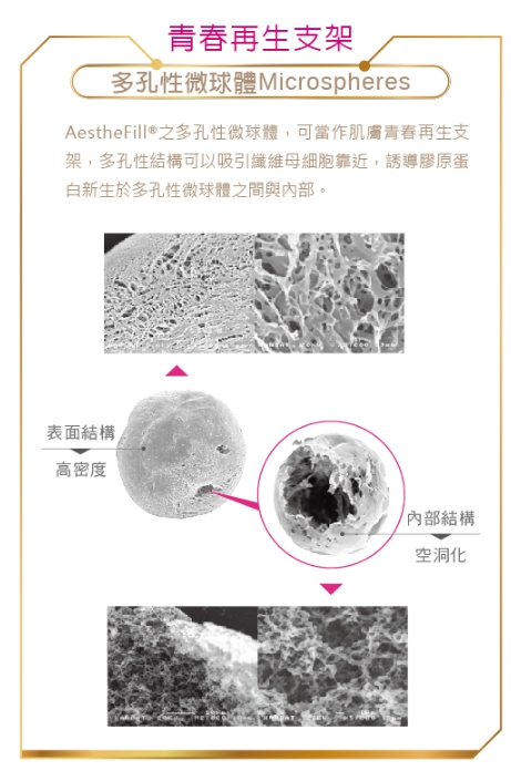 AestheFill®艾麗斯的產品外觀為白色球體,使用前需用無菌水泡製至少30分鐘使其溶解。泡製後的聚雙旋乳酸,在高倍數顯微鏡底下,會看到空洞的球體,這就是AestheFill的「多孔性微球體」科技。多乳性微球體進入皮膚後,會吸引纖維母細胞靠近,誘使第一型膠原蛋白於多孔性微球體之間與內部形成生長,漸漸長出更多自己的膠原蛋白。