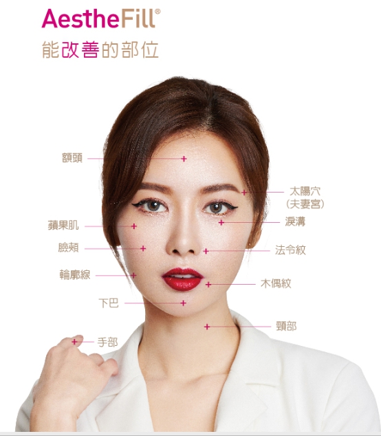 AestheFill®艾麗斯適合用於全臉雕塑治療,包括太陽穴(夫妻宮)凹陷、蘋果肌、雙頰凹陷、法令紋、木偶紋(口角紋)、下巴線條及臉部皮膚的鬆弛下垂都能改善,也可應用於頸部與手部紋路的改善。