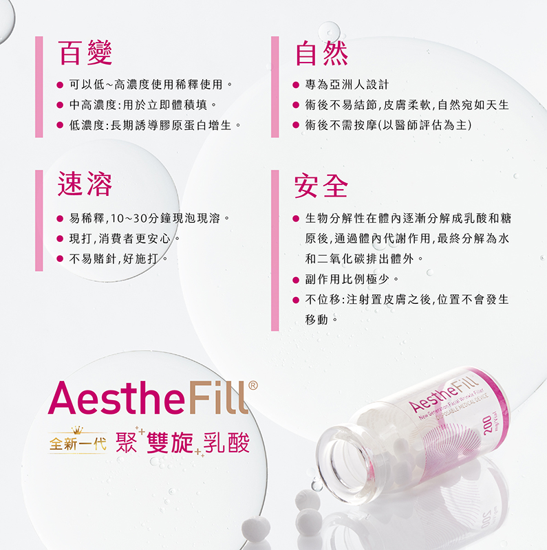AestheFill®艾麗斯是一種新型態的聚“雙旋”乳酸(PDLLA),它從玉米和馬鈴薯可再生資源中提取而合成的熱塑性高分子材料,是一種與生物相容及能被生物降解的材質,已在醫界使用多年。AestheFill聚雙旋乳酸注入肌膚底層後,能促進皮膚膠原蛋白及彈性纖維的生長,有效改善鼻唇溝、皺紋與面部整體問題,屬於自然的膠原蛋白增生劑。