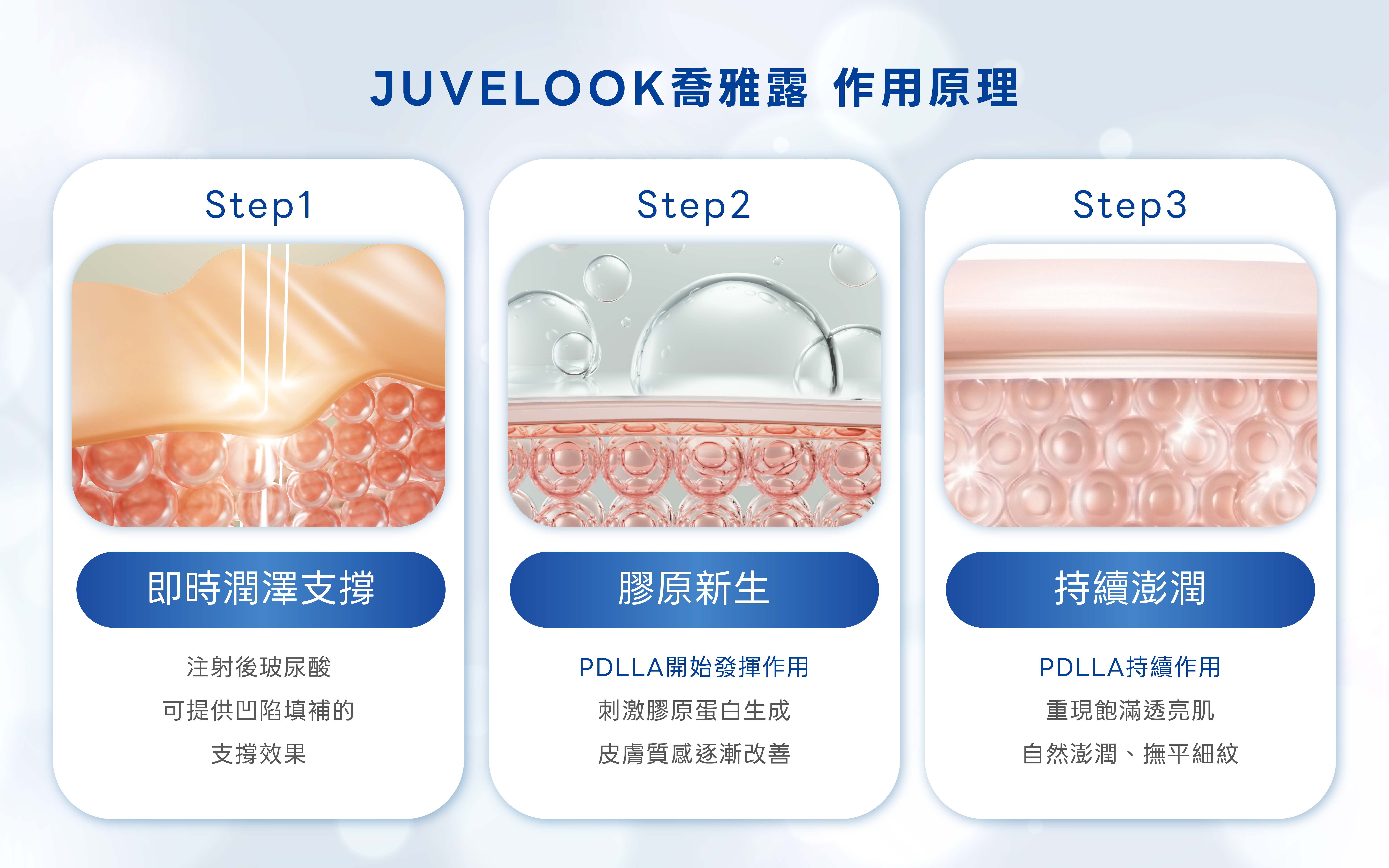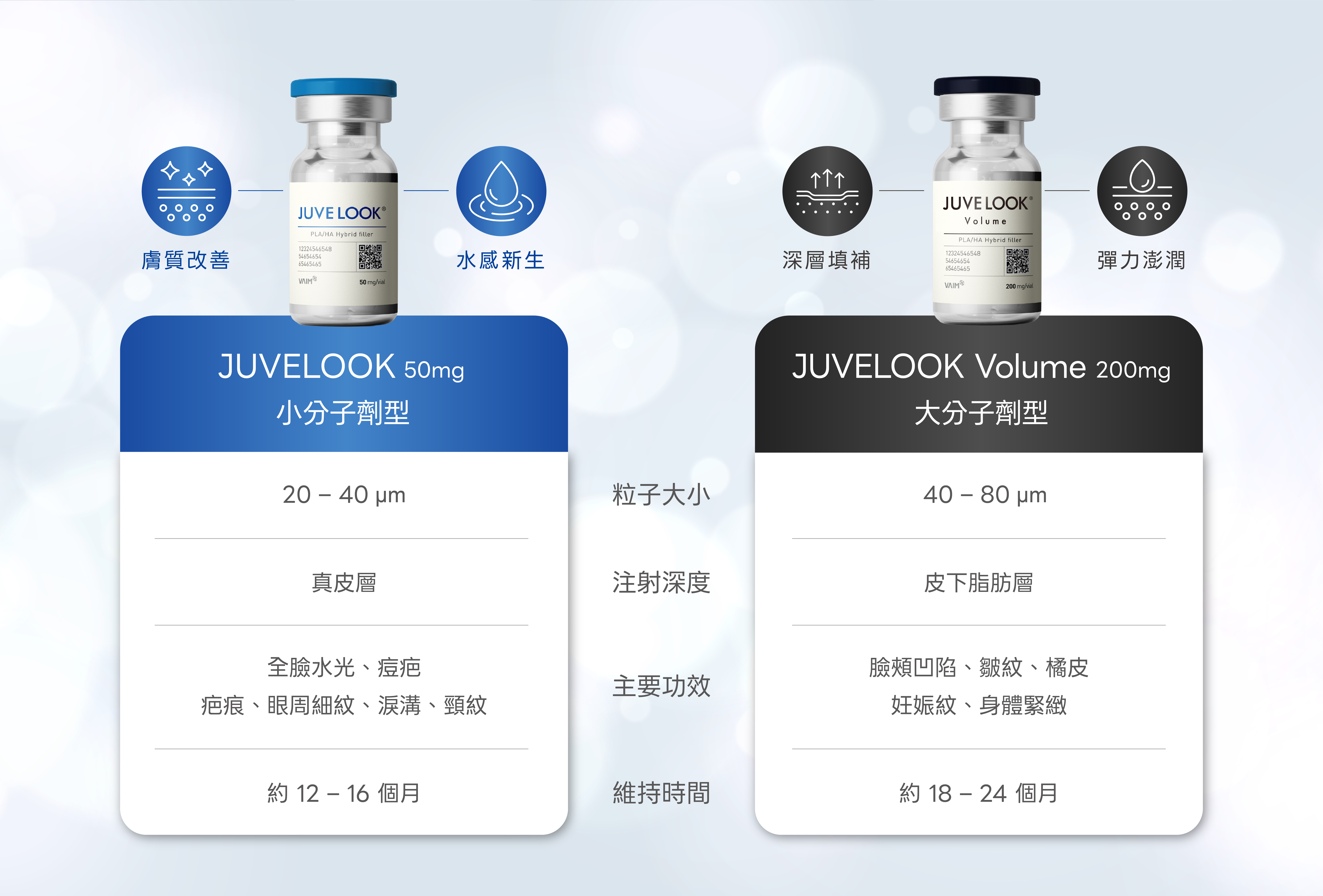 ● Juvelook(小分子):適用於膚質調理,協助改善粗糙、乾燥與細紋,打造透亮細緻肌膚。