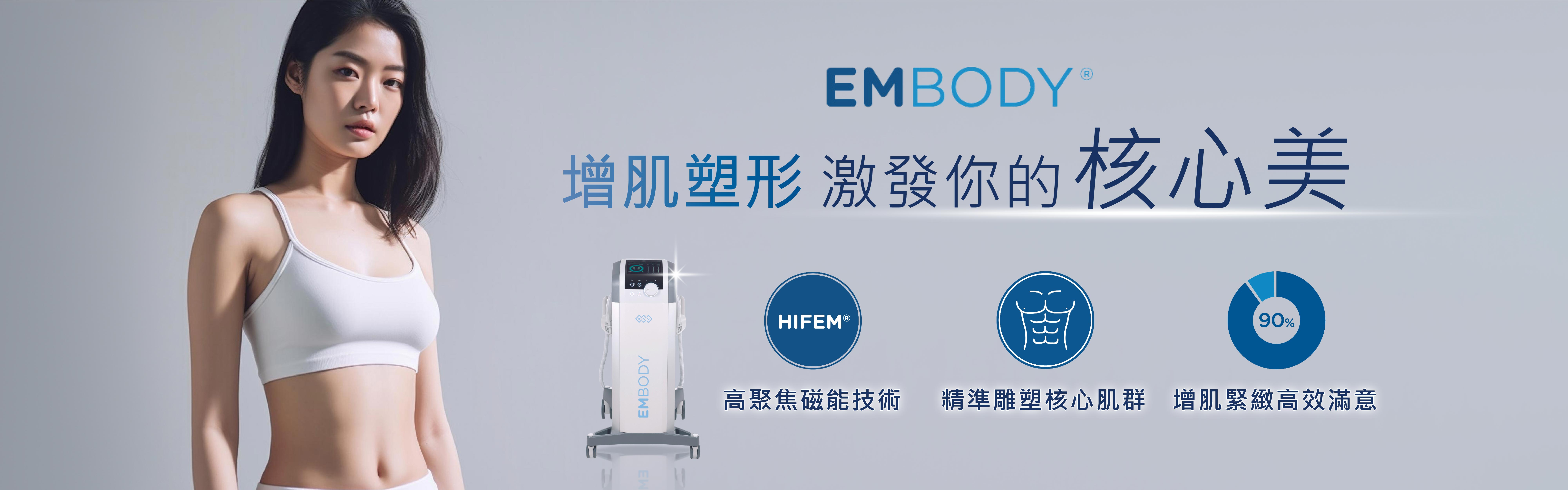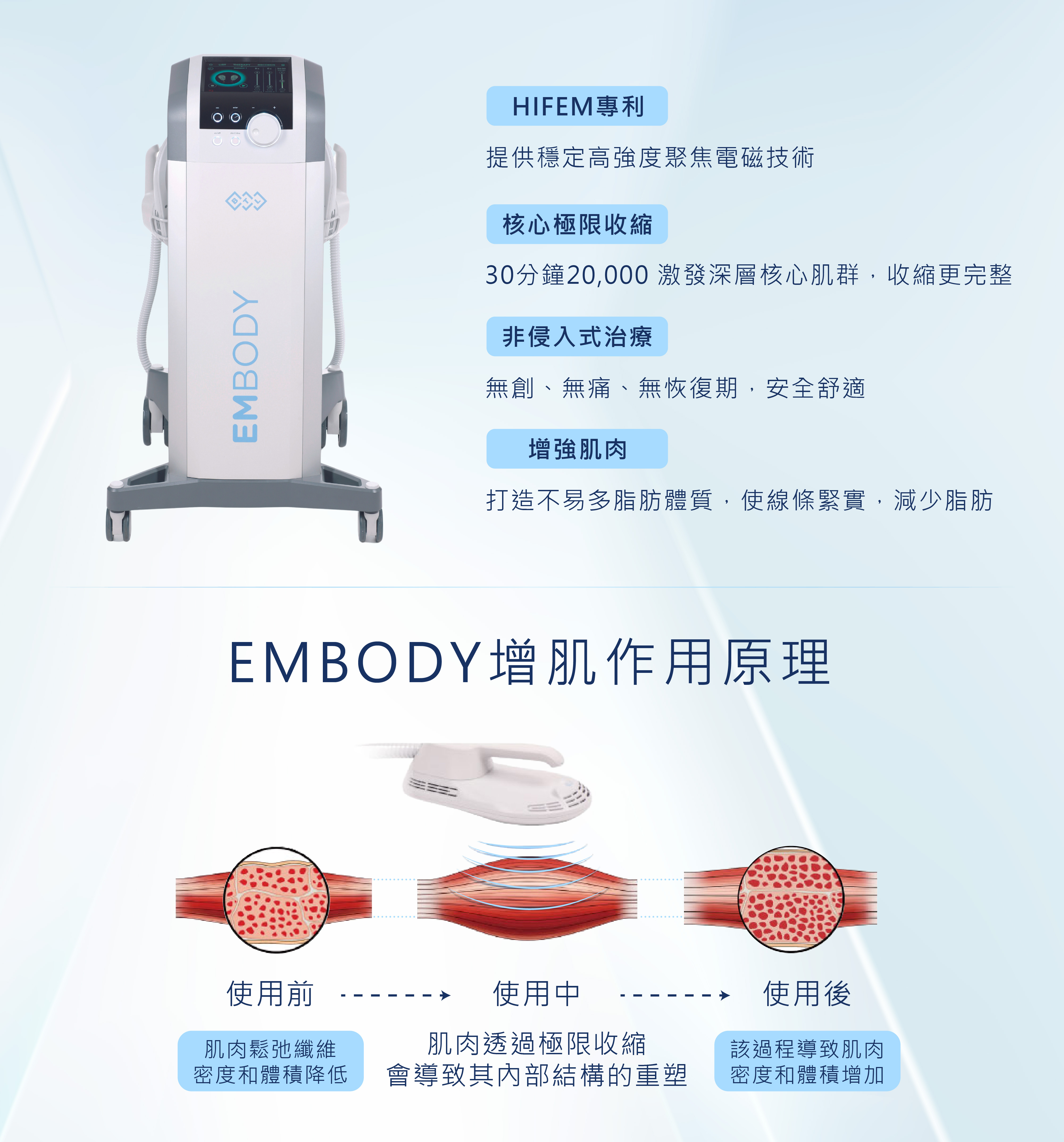 EMBODY 內建 HIFEM 專利技術,誘發肌肉產生極限收縮,而肌肉處於極限收縮狀態時,會促進核心肌肉內部深層的結構重建來適應這種極限狀態。達到肌纖維體積增大(肌肉肥大,Hypertrophy),從而讓新的蛋白質鏈和肌原纖維的產生(肌肉增生,Hyperplasia),最終達到肌肉密度和體積增加。同時,極限收縮運動也使腎上腺素的水平上升,激皮下脂肪分子分解為甘油及游離脂肪酸,而游離脂肪酸將會被帶到線粒體之內引發脂肪細胞大量裂解,進而誘發脂肪細胞凋亡,並由身體自然代謝