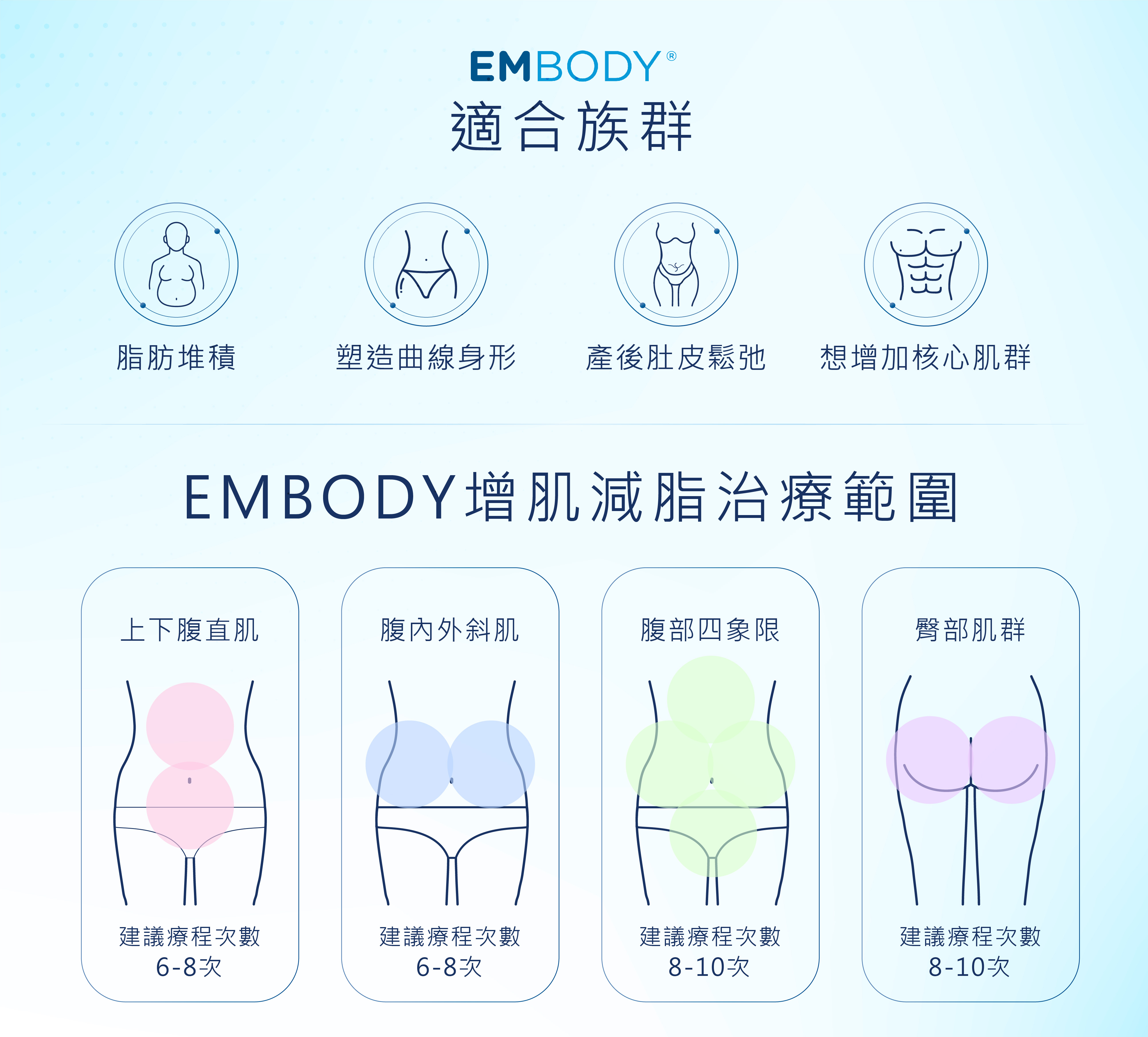 運動好累!有沒有可以不用運動也能讓肌肉變結實?減脂過程艱辛,增加肌肉更是難! EMBODY增肌減脂能在30分鐘針對特定肌群做訓練,讓腹肌線條更明顯,腿部更結實,增肌蜜桃臀。